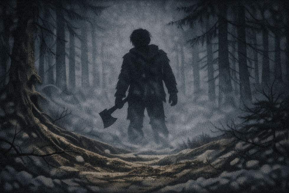 On peut parfois l’apercevoir, très loin, entre les troncs, quand la lumière tombe et que les silhouettes se confondent. Un homme gigantesque, qui semble poilu, trapu. Et toujours une hache à la main.